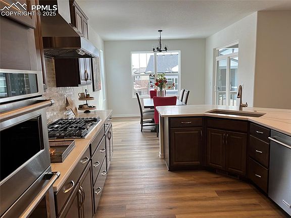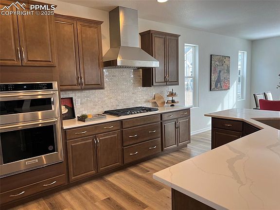 This two-story home has beautiful views of Pikes Peak from the covered rear deck and includes a full finished garden-level basement, a 3-car garage plus a tandem space perfect for motorcycles, small cars toys or tools, a 16x10 covered deck off the dining nook that has an installed gas line for your grill or patio heater. The kitchen is open to the living and dining nook and features a spacious island, walk-in pantry, and a KitchenAid appliance package with a 36” gas cooktop with a hood that vents to the outside, an oven/microwave combo and an upgraded (low decibel) dishwasher. This home comes with beautiful interior finishes to include a gas fireplace with stacked stone and a stained box mantle, and luxury vinyl plank floors on the main living areas. The custom master bath layout also includes a large shower with Euro glass enclosure and a tub. There is also a loft on the upper level, as well as two additional bedrooms. The laundry room on the upper level also includes a free-standing sink. There is one bedroom on the main level and a full bath perfect for guests or to be used as an office. The garden-level finished basement has plenty of natural light and 9' foundation walls. The rec room is pre-wired for surround sound and includes a beautiful wet bar that will be perfect for movie nights and entertaining. Other features include: Air conditioning, Under-cabinet lighting in the kitchen, smart home thermostat, 42" upper cabinets in the kitchen, built-in bench seats and cubbies in the mud room, and the addition of optional windows.