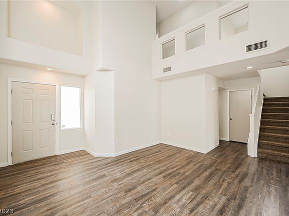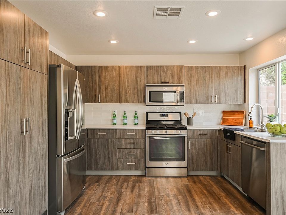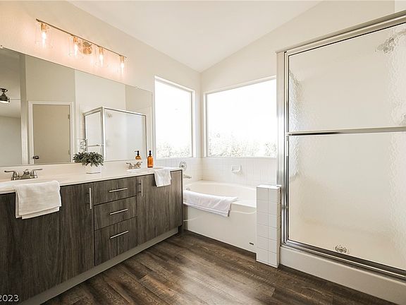 This sleek Summerlin home elevates suburban living to new heights. Beginning with a wide open, relaxed floorplan and finished in modern materials, this house feels like home the moment you walk in! Premium plank flooring extends throughout the 1st floor, and is complemented by plush new carpet in two of the bedrooms. In a kitchen built for cooking, lavish counters sit atop contemporary cabinets accented by brushed silver hardware, stainless steel appliances and glass tile backsplash. Upstairs, an opulent primary suite begins with a massive bathroom featuring a double vanity, separate shower & soaking tub. The palatial closet and mammoth bedroom finish this unforgettable sanctuary. Outside a relaxing patio offers a tranquil place to sit in a backyard teeming with plants, over a foundation of green grass! Call your favorite agent and schedule your private tour today!
