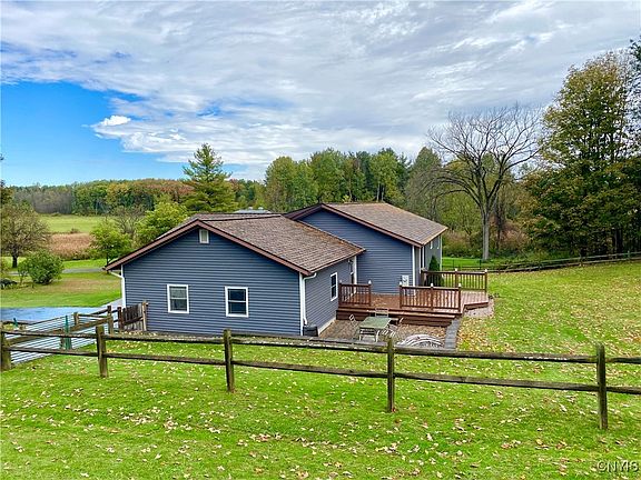One story living with a beautiful 1 acre yard! 3 beds 2 baths, including a master. Large open floor plan great for kid play or cane and walker traveling depending on what stage of life you're in! 2 rooms besides the bedrooms with enormous potential. One is currently housing the washer and dryer, but they could easily be moved back into the bathroom if the extra room is needed! Also, another room that was used for an office! Full, partially finished walk-out basement. Great yard surrounded by a split rail fence, boasts a great deck as well as a patio. Storage shed in the far corner to accommodate garden essentials. 2 stall attached garage, paved driveway. New roof in 2020. Ranches are in high demand! Call Julie @ 315-777-2689 for a showing or contact your Buyers' agent.