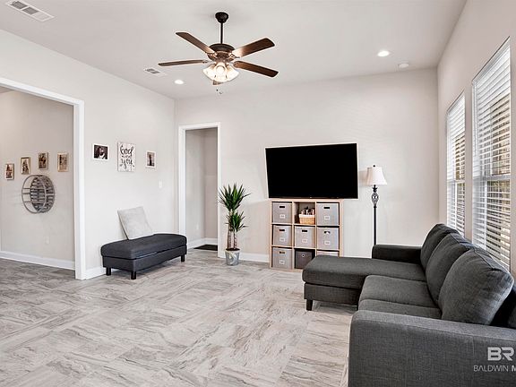 Welcome home to this LIKE NEW GOLD FORTIFIED home in Majestic Manor, sitting in a quiet cul-de-sac! This beautiful craftsman style home features an open concept floor plan with 3 bedrooms and 2 full bathrooms. 16 inch NEWLY INSTALLED ceramic tile flooring throughout (installed about 6 months ago per seller). The kitchen features upgraded white cabinets with upgraded hardware, granite countertops, stunning backsplash, large island, and stainless steel appliances. The spacious primary ensuite features tray ceilings, dual sink vanity with upgraded white cabinets & hardware, garden tub, separate shower and oversized walk in closet! Additionally you'll find spacious utility room (with entry to the primary closet), 2 car garage, a covered patio with NEW PERGOLA to enjoy your fenced in backyard, and blinds throughout! Playground area in the back yard can stay or be removed at buyers request! Pride of ownership is obvious in this home - newly upgraded lighting in the hall, kitchen, and dining area, the garage floors, driveway, and walkway have been sealed, safety timers have been added to exterior lights, new shiplap accent wall, and the electrical outlets have been upgraded to USB. Centrally located near shopping, dining, and just a short drive to the white sandy beaches of Gulf Shores!
