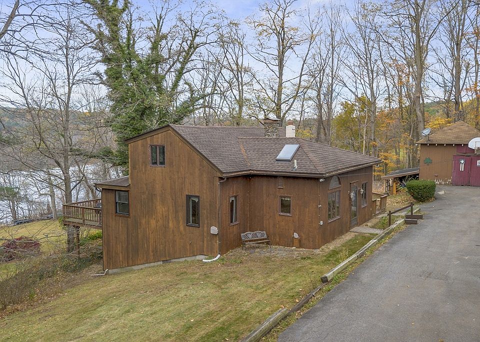 Waterfront retreat on scenic Massapoag Pond! Enjoy year-round beauty—swim, boat, or skate right from your ownshoreline. Set on 1.1 acres, this unique property offers sweeping water views from nearly every room. The home lives likea two-story chalet, featuring a soaring central atrium with two open lofts, first-floor bedrooms, a screened porch, and anupdated kitchen. A large shed provides space for tools and lake toys. This special property is being sold as is with a failedseptic system—traditional financing will not apply. Bring your vision and make this waterfront getaway your own.Vacation at home!