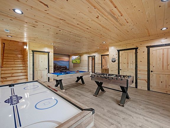 Welcome to your dream mountain retreat! Sitting just 3 short miles from the center of Pigeon Forge, this newly constructed cabin is situated on over 5 acres of a gorgeous, mountaintop view with no HOA in the way. Boasting 5 master suites (5 full bedrooms and 5 full bathrooms) as well as 2 half bathrooms, 3 levels and over 4,300 sq ft., this cabin is the epitome of luxurious mountain living. In addition to a master suite equipped with a large washer and dryer, the main level features cathedral ceilings, a custom crafted electric fireplace, large windows to enjoy the view, a large smart TV for cozy nights in, a dedicated dining room, and a beautifully stocked kitchen equipped with butcher block countertops and stainless steel appliances. From the main level, step out onto the massive, 10' wrap-around porch, ideal for hosting unforgettable gatherings or simply enjoying some rest and relaxation. Perfect for you and your guest, the lower level boasts a lavish recreation room with a large sectional couch, 75-inch smart TV, pool table, air hockey table, foosball table, and a custom crafted wet bar. This level is home to the second and third master suite bedrooms, just steps from another spacious 10' deep deck featuring a large hot tub. Nearby, a cozy fire pit with lounge seating awaits the evening. The upper level features a large, loft space and two additional master suites. The loft is plenty spacious for additional amenities or lounging. Outside, a paved driveway offers ample parking space for multiple vehicles. This new cabin boasts impressive annual rental projections of $125,000-$150,000. Investors take note — fully furnished, just minutes from Dollywood, numerous attractions, Pigeon Forge and Gatlinburg, newly built spacious cabin sitting on over 5 acres of gorgeous mountaintop views — book your showing!