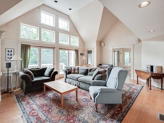 Nestled on 2.14 acres of serene landscape, this enchanting custom cape home offers privacy and tranquility. Throughout this residence, exquisite detailing and artisanal craftsmanship are on full display, showcasing intricate millwork, built-in cabinetry, pocket doors, specialty windows, and hand-stained hardwood floors. The heart of this home, the gourmet kitchen, boasts a butcher block center island, gleaming bleached red oak hardwood floors. The inviting two-story family room features 4" wide oak floors, a cozy fireplace, and Anderson sliding doors leading to a rear deck that provides a perfect spot for relaxation and outdoor enjoyment. Additional features include central air for year-round comfort, sturdy 2x6 framing, and a walk-out lower level, adding to the home's functionality and value. This home offers a harmonious blend of elegance and natural beauty, making it a truly exceptional living space.between "year-round comfort".
