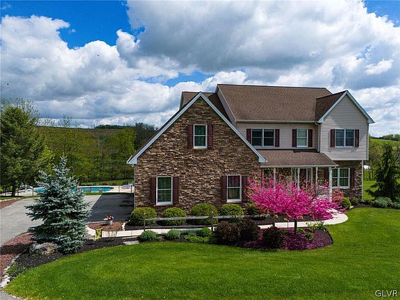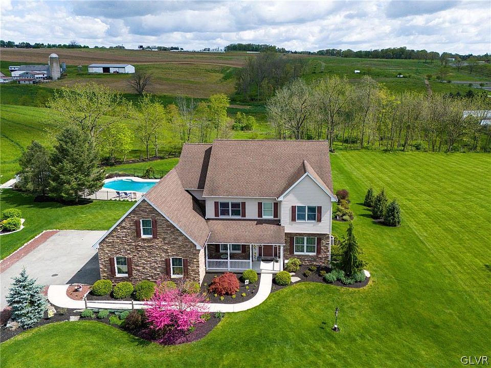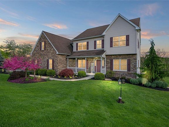 This stunning custom-designed colonial, introduced to the market for the very first time, was meticulously crafted in 2006, boasting over 3,600 square feet of luxurious living space. Nestled on over an acre of serene landscape, it's conveniently located mere minutes from major highways, yet tucked away adjacent to two expansive farms for a tranquil retreat. Step into elegance and comfort as you're greeted by breathtaking panoramic views of rolling hills and stunning sunsets from the expansive Trex deck, overlooking the inviting in-ground pool and patio area. Indoors, discover a wealth of desirable features, including gleaming hardwood floors gracing much of the main level and a chef's dream kitchen adorned with granite countertops and a spacious island. Perfect for hosting gatherings, the generous living room and dining room offer ample space and seamless access to the deck, ideal for enjoying the lush backyard. Ascend to the second floor to find four generously sized bedrooms, including the sprawling master bedroom suite complete with a full master bathroom featuring a whirlpool tub, shower, and double sinks, and vast walk-in closet, accommodating your entire wardrobe with ease. The finished lower level offers over 600 sq ft of additional living space, boasting walkout doors leading to the lower patio and a full bathroom, providing convenient access from the pool area. Ample unfinished storage space and a third garage bay round out this level, perfect for storage or workshop