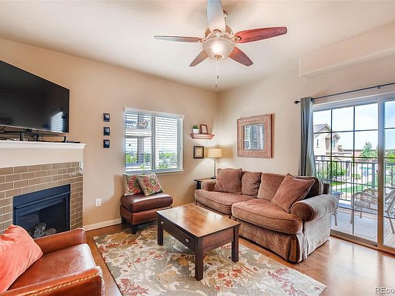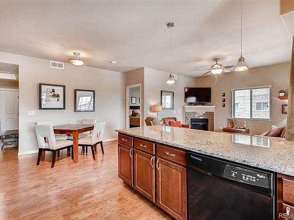 Fabulous 2 bedroom 2 bath CONDO with STUDY in Highlands Ranch Town Center. One level living. Open floor plan with a spacious master suite, walk in closet and private master bath. The large kitchen boasts slab granite, 42"cabinets, stainless steel refrigerator, microwave, stove and dishwasher all either brand new or less than one year old. Fresh neutral paint and new carpeting and pad. The dining space opens up to the family room with a corner gas fireplace. Beautiful mountain and sunset views from your large covered balcony. A second bedroom and a full bathroom enhance this superior condo. French doors open to a flex/office space with bifold doors to the standard size washer/dryer which are included. This condo unit is approximately 150 SF larger than most 2B/2B units in the complex. The underground heated garage allows for one assigned parking space and a secure storage space located in front of it. The HOA covers trash, water, snow removal and access to all 4 recreation centers each of which has both indoor and outdoor pools and exercise equipment. Experience peace of mind with the secured building entrance. Smoke free property. Close to Town Center restaurants, shopping library and Civic Green Park. Move-in ready!