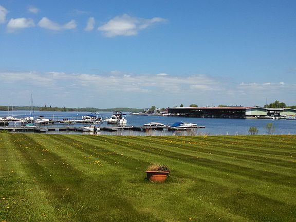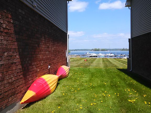 This townhouse has a spectacular view of the St. Lawrence River with a sprawling lawn overlooking it for lounging in the sun, volleyball or frisbee fun. Watch the ships slink by from the mater bedroom's upper balcony or the while sitting on the lower deck enjoying a bbq. Each unit has two parking spaces and the quaint village of Clayton is just over the French Creek bridge. Two bedrooms upstairs each have a full bathroom as well as a half bath off of the kitchen downstairs. This is easy living with no lawn care and a gorgeous view of the water, minus paying waterfront taxes!