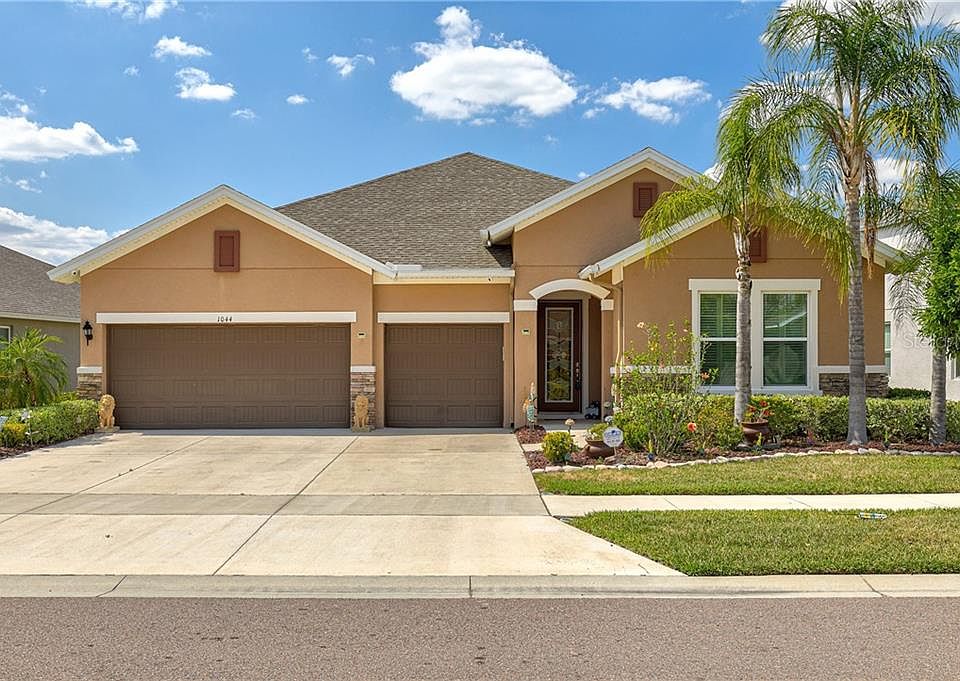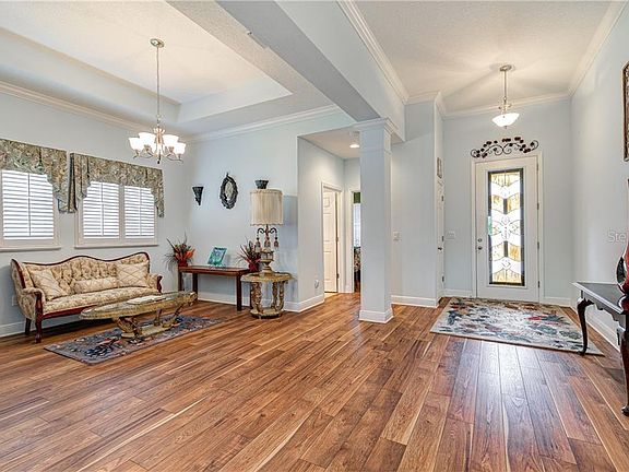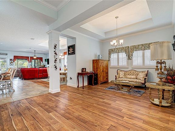 Picture perfect home with a water view awaits you! This 3 bedroom, 3 bath home has many unique features that are apparent the moment you walk through the stained glass front door. A large, beautiful kitchen will immediately catch your eye and features beige wood cabinets, closet pantry, quartz counter tops, new stainless steel appliances, a $5000 refrigerator, double oven and propane gas stove for cooking all your favorite meals! The home features wood flooring throughout the main living spaces and bedrooms, and tile in the kitchen and bathrooms. The master suite can be accessed through double doors and includes a large master closet and safe, a master bath with granite counter tops, double sinks, a shower and a Jacuzzi tub. There's also a second master bedroom and bathroom combo in this home. If the beautiful interior features aren't enough, step outside on the enormous screened in lanai that will meet all of your outdoor entertaining needs. Highlights of this outdoor space include brick pavers throughout, an outdoor kitchen and grill, surround sound speakers and a nice view of the neighboring pond. Additional features of this home include plantation shutters, electric remote controlled blinds, a water softener system, 3 car garage, front motion detection sensors and wiring for a security system. There are too many great features to list them all. Come see for yourself today!