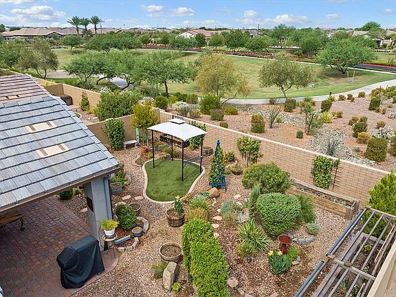 A COZY COTTAGE IN ENCORE & THE ULTIMATE IN RESORT STYLE LIVING - THIS ONE CHECKS ALL THE BOXES!!! Original owners have lovingly maintained this home and you'll find many custom features throughout. ONE OF THE BEST LOTS IN THE COMMUNITY backing to the greenbelt and just a few homes down from the pool & spa, tennis/pickleball courts and bocce. The impeccable kitchen boasts plenty of wood cabinets, recessed lighting, granite counters, a pantry, stainless steel appliances, wine refrigerator and a center island with a breakfast bar. The backyard garden is a picturesque oasis that beckons with its lush greenery and colorful blooms - absolutely delightful! A collection of raised beds is ready for your assortment of vegetables and herbs. From the wood-like plank tile floors to the plantation shutters and board and batten accent walls...this one looks like a model home. The popular "Tango" model has a spacious feel that only this particular floor plan can offer. Fully finished extended garage has a separate A/C, has been insulated and includes overhead storage racks. The ENCORE AT EASTMARK community by Taylor Morrison provides the active lifestyle you are seeking. Resort style heated pool and hot tub, tennis, bocce ball and PICKLEBALL courts. The clubhouse features a fitness center, billiards room, library and multipurpose room with an event lawn for hosting larger events. They even have a craft room and a café! In addition, there are regularly scheduled workshops that include Yoga, line dancing, ceramics, pottery and water aerobics classes. Welcome home to one of the most beautiful and amenity packed Active Adult communities in the East Valley.