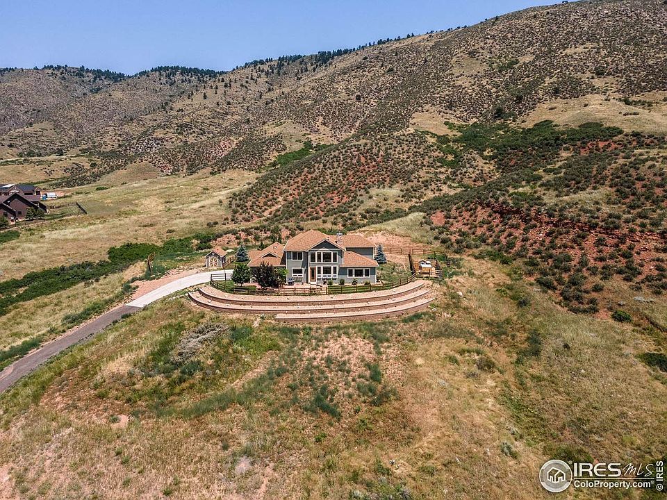 It's hard to find homes like this one, located within 20 minutes of Fort Collins, but with unspoiled, 360 degree views of pristine mountains within a gated, secluded neighborhood. The wildlife pay their respects regularly here, and there's a gorgeous retaining wall and landscaping with lush plants and lights to greet residents and guests to this gorgeous home. The fenced yard incorporates a small shed, a smaller fenced area for dogs with an irrigation system, a garden, and a separate area that could house chickens. There's also a three car garage with additional space for a workshop or additional storage. Inside, a large stone fireplace anchors the main living area, and complements the dramatic staircase leading to the upper level. You'll find an enviable walk-in closet, and an en suite master bath with twin sinks and an open shower. Finally, that home office space with sweeping views of the mountains finishes most anyone's dream home wish list.