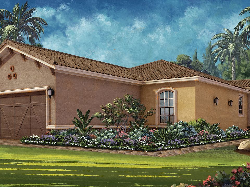 The Roma is a 1,689 sq. ft. single-family villa home with two bedrooms and two baths. The spacious Master Suite includes a picturesque bay window along with dual sinks in the bath and walk-in closet. A designer kitchen overlooks a great room with sliding doors to a covered lanai. A laundry room and two car garage complete this villa home with flexible space options and upgrades available.