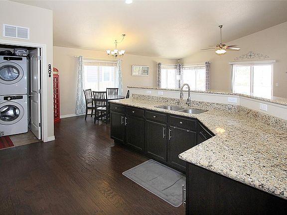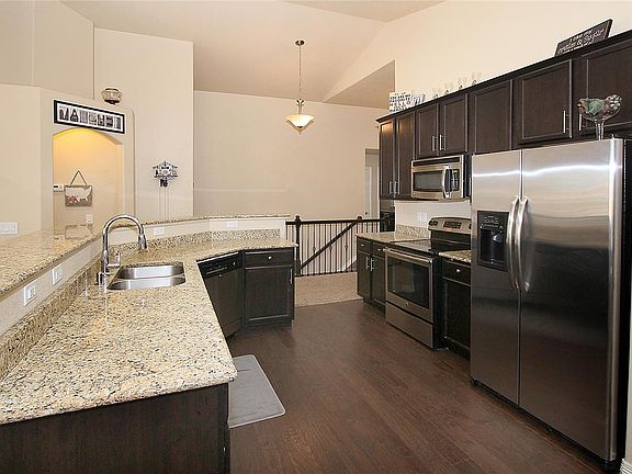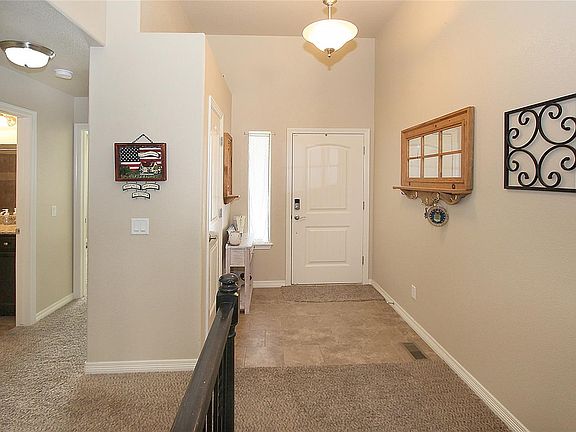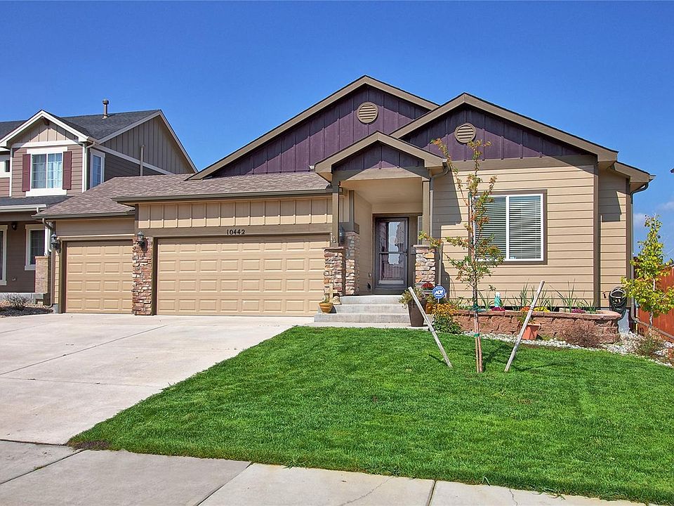 This ranch style home is located in the golf and recreation community of Meridian Ranch. This home features five bedrooms, three baths and three car garage. An adorable covered porch greets you with tile entryway. The eat-in kitchen offers stainless steel appliances, granite counters, recessed lights, and a pantry. The living room has a vaulted ceiling and sliding glass door to the landscaped backyard abundant in fruit and vegetables. The spacious master bedroom and bathroom offer a relaxing, retreat-like setting. You will love the separate shower, soaking tub, double vanity and a large walk in closet with tons of storage. Two additional bedrooms, a bathroom and a laundry room are also on the main level. The basement offers a large family room, two additional bedrooms and a bathroom with recessed lighting in the shower. The tall ceilings make the lower level feel larger, and the utility room offers extra storage. This home has all the upgrades you need, and brand new central air.