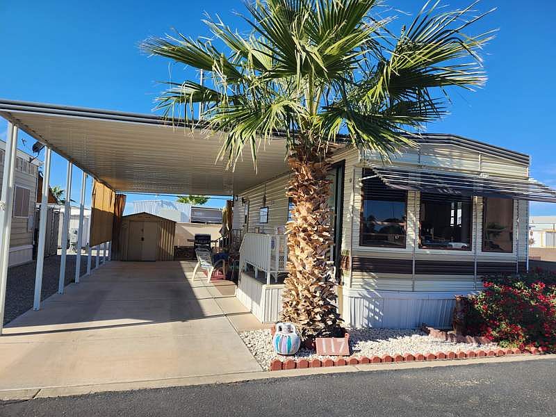 This beautiful 1984 fully furnished home has bathroom attached to the master bedroom. It has tons of storage for your belongings, 2 car carport, spacious shed. this home is located right next to the clubhouse, laundromat, pool, and other amenities in our wonderful 55+ Community Las Quintas RV Resort. It is not located in a pet area. Priced to sell, call us to make an appointment. it won't last long.