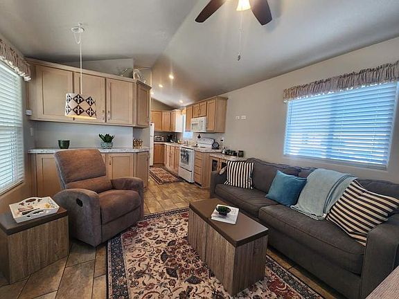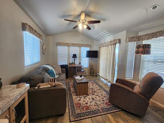 This gorgeous 2020 1 bed/ 1 bath fully furnished home is move in ready! it has vaulted ceiling, recess lighting, washer/dryer combo in the shed. located in the pet area of our beautiful 55+ community. This home has lots of storage space, beautiful flooring throughout. Definitely a must-see!! Call to make an appointment today at Las Quintas RV Resort!!