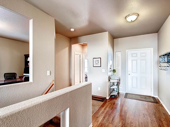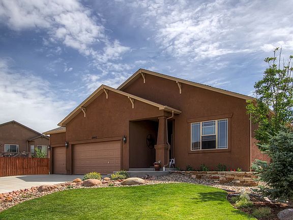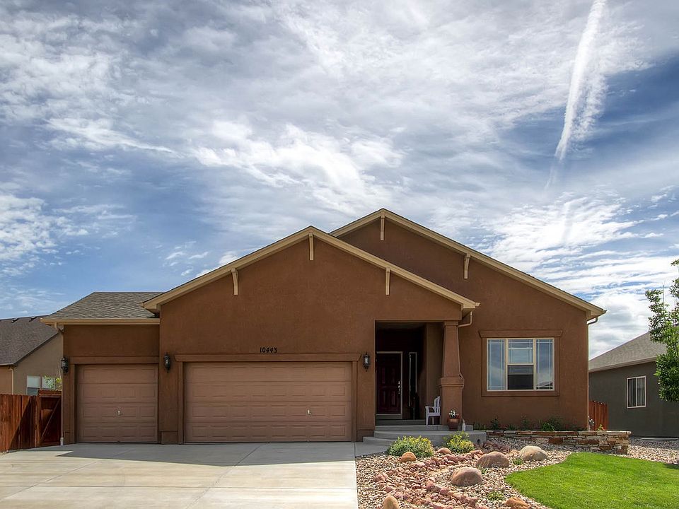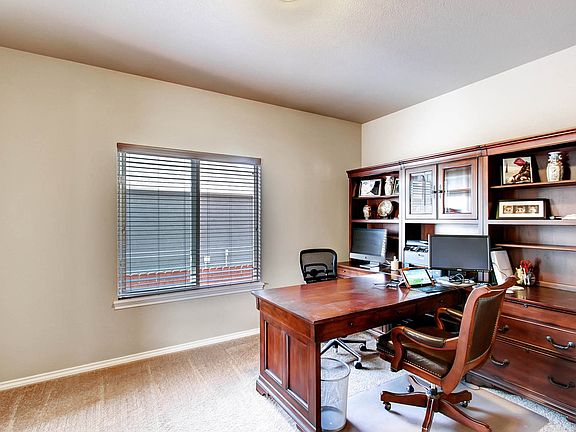 Beautiful ranch style home with 4-car garage in Meridian Ranch Golf Course community! Gorgeous kitchen with open great room concept! Corian counters, stainless steel appliances, hardwood floors and eating nook. Formal dining room. Main level living! Large master suite with 5-pc bath! Huge finished basement with additional bedrooms and bathroom. Stamped concrete patio and gorgeous landscaping. Fenced back yard! Mountain views! Surround sound on main level Plumbed for a wet bar and 4th bathroom in the basement. HUGE storage area is intended for an additional bedroom if needed!