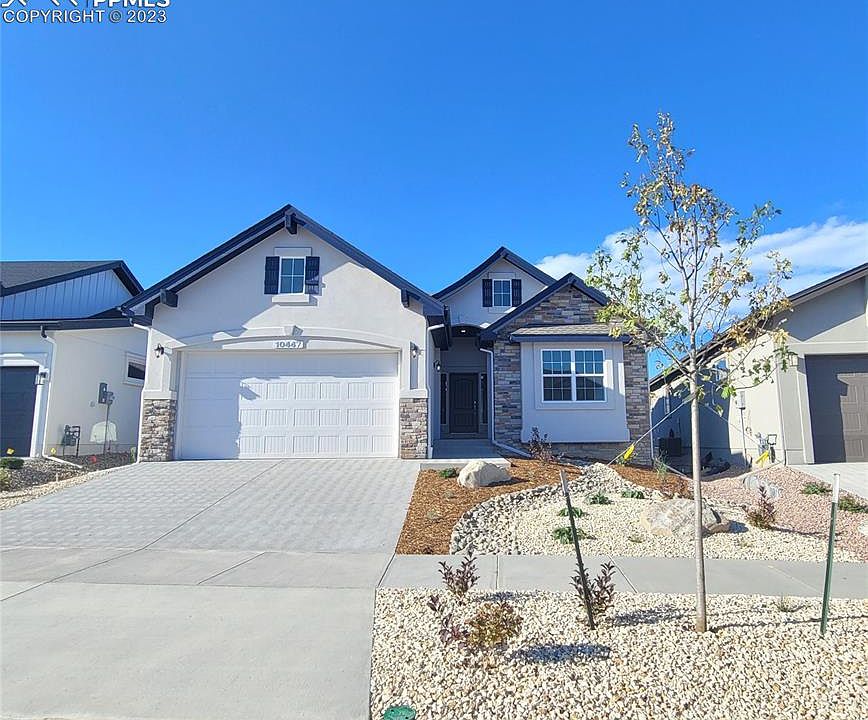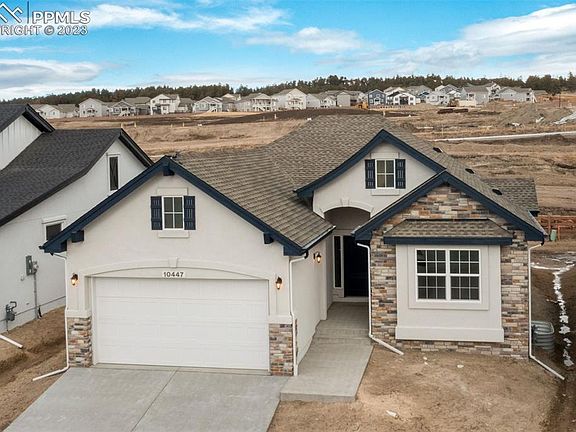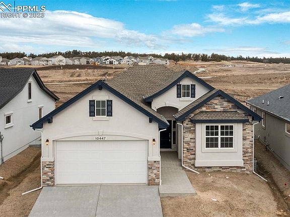 FRONT YARD LANDSCAPING! Welcome Home to the Somerton II, ranch plan in a European elevation with an over-sized 2 car garage! Relax in the Great room with engineered hardwood flooring in front of the gas fireplace. The Kitchen with granite slab counters, stainless steel appliances, pyramid hood, pantry, and large island providing additional seating. The dining nook walks out to your private patio. Master suite is accompanied with a plush 5-piece Master bathroom and walk-in closet. A secondary bedroom, full bathroom, and laundry room complete the main level. The finished lower-level boasts 9' ceilings and a spacious Family room prepped for a future wet bar. Two over-sized bedrooms with walk-in closets and a full bathroom complete the lower-level. This energy rated home has a tankless water heater, 96% energy efficient furnace, pex water piping, air conditioning, and sealed ducts. Backing to open space and located in a cul-de-sac in the Desirable Highline at Wolf Ranch Community!