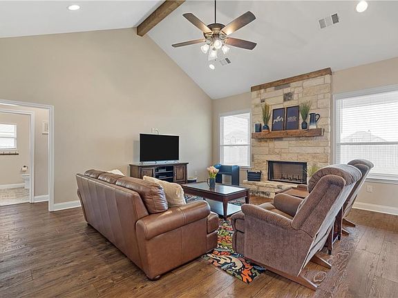 Less than a year old, this Creekside Addition home with farmhouse asthetic is practically brand new! The bright and open living area features a wood-burning fireplace and soaring vaulted ceilings. The focal point of the home is the oversized island with ample seating space in addition to the large dining area. Additional features in the kitchen include a porcelain farmhouse sink, granite countertops, and a corner pantry. A cute mud area with coat hooks, padded bench and shoeboxes is conveniently located between the garage and the extended laundry room with extra cabinetry and built-in desk! Three sizable guest bedrooms feature well thought out closets and are located near the guest bath with dual vanities. The isolate main bedroom features a bright en suite with separated vanities, separate garden tub, tile shower, and a large closet with built-ins. Backyard features include a covered patio, wood privacy fence, and storage building on a concrete slab. Sidewalks throughout the addition make walking and exercising safer! The only thing this home needs is you!