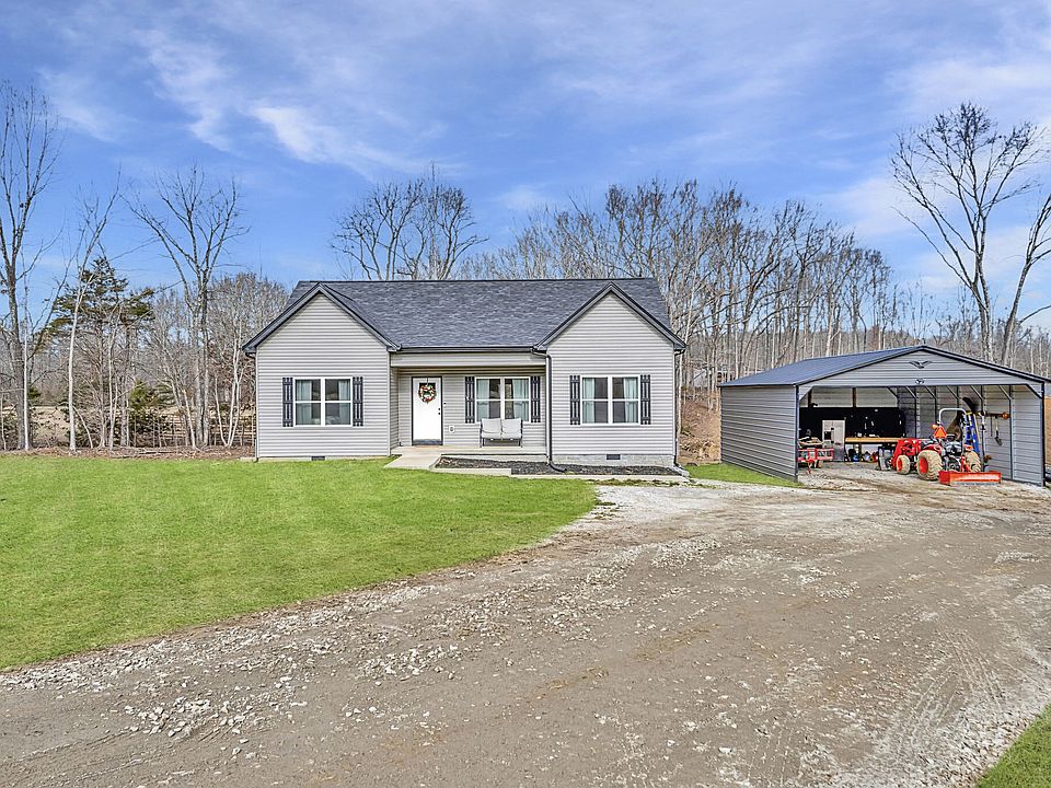 BACK UP OFFERS WELCOME (kick out clause in place) Listing price is BELOW appraised value of $380k!!!! 2022 Build nestled on 5.65 Acres. Open concept MAIN LEVEL LIVING. 2 Car detached 24X30 carport. 10ft ceilings throughout and 14ft sky high ceilings in living room that is spacious enough to fit your sectional!! Back deck recently covered perfect for ENTERTAINING.. WORK FROM HOME with high speed internet!! Primary bedroom features full sized bathroom (with built in blue tooth speaker) and walk in closet. *Gas/Tankless water heater *Granite kitchen countertops *Easy shut kitchen cabinets *FRESH gravel driveway put in 2024 *Fresh rye grass/ straw mats for fast growth put in 2024 *Yard recently cleared of trees near house for spacious feel. *2+\- acres of cleared land perfect to put a pond/ fenced in *WELL MAINTAINED - current 3 month termite contract in place. ** Built by LOCAL experienced builder known for excellent craftsmanship *NO HOA *Perfect for Nashville/ Clarksville Commuters