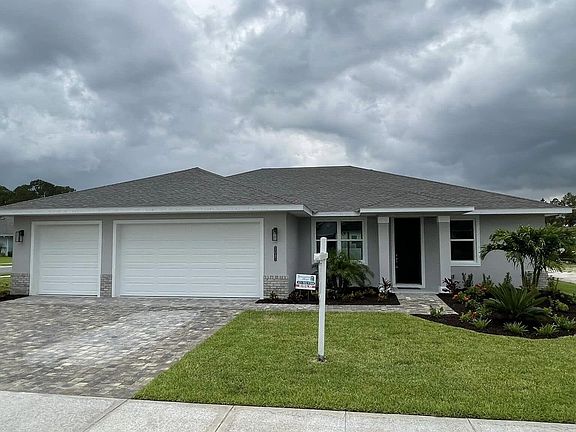 LOT 47 CORNER LOT - Welcome to Palm Bay's newest exclusive community featuring 50 total home-sites. New Home Construction is underway on this beautiful 3 bedroom, 2 bath, 3 car garage home with a large covered lanai. This home offers a large great room / open plan design with Dining area, spacious kitchen with many beautiful upgrades. The master suite features 9'4'' ceiling, 2 large walk in closets, and Master bath retreat with large tile walk in shower, & dual sinks with Quartz countertops. Oversized Laundry room with extras! Attention to detail in every aspect of this home from flooring, to lighting, cabinets & more. Community offers city water & sewer lots, nice lake-views when entering into this quiet neighborhood. 98% READY! Est Completion end of MAY 2024