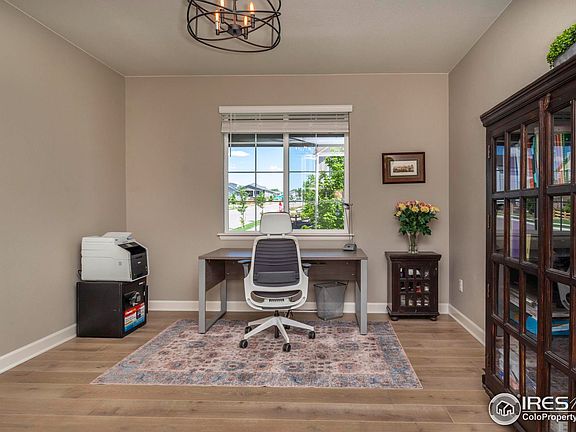 In the coveted Rose Farm Acres neighborhood, discover this 2-story home perfectly situated on a corner lot with breathtaking mountain views. The open concept main level boasts vaulted ceilings and abundant natural light, creating an inviting and spacious atmosphere. The stunning kitchen features an expansive island with barstool seating, ample cabinetry, and a walk-in pantry conveniently located off the mudroom. The dining room, surrounded by windows, provides seamless access to the covered deck, which is equipped with a built-in grill ideal for entertaining family and friends. The expansive living room offers a perfect gathering space, while a spacious office near the entrance ensures privacy for remote work. Upstairs, the home features 4 well-appointed bedrooms, including a luxurious primary suite with a 5-piece en-suite bath and a generous walk-in closet. Two of the secondary bedrooms have walk-in closets; one includes an en-suite bath, while the other two share a large bathroom down the hall. The laundry room is exceptionally roomy with additional cabinetry. The finished walk-out basement provides versatile living space, featuring a 5th bedroom, a 3/4 bath, a spacious rec room, and a wet bar. The 3-car garage is designed with 8' tall doors to accommodate larger vehicles. Conveniently located close to Berthoud High School & Bein Park, and it's less than a mile from Downtown. With easy access to Hwy 287 and I-25, commuting and travel are a breeze.