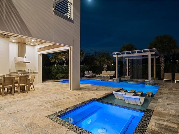 Located in the privately gated Bear’s Den neighborhood of Reunion Resort, this 8-bedroom, 8-full-bathroom, 2-half-bath home offers 5,625 heated sq ft and was built in 2018. The property has 12-foot ceilings on the first floor, a 2-car garage, and is offered fully furnished and turnkey. The home has never been rented and has only been used as a second residence. The kitchen features a double island layout, modern high-gloss cabinetry with lighted glass-front uppers, white quartz countertops, a JennAir gas cooktop with Zephyr range hood, two 36” JennAir built-in bottom-freezer refrigerators, a JennAir wall oven and microwave, and three JennAir dishwashers.The open living area connects to the outdoor space through corner sliding doors that lead to a covered patio with fireplace, a covered dining area with a built-in gas grill, vent hood, and sink, and motorized screens enclosing the entire space. The heated pool and spa include a sun shelf, an in-pool table with seating, and a pergola with a waterfall feature. An additional seating area with gas fire pit sits at the back of the pool, and a pool bath is accessible from the patio. The backyard has a private gate that leads directly into Golden Bear Park, available only to Bear’s Den residents. The park includes a putting green, great lawn, volleyball area, playground, and dog park. Every bedroom has its own bathroom, including two bedrooms on the first floor. The primary suite features dual sinks, a freestanding tub, a walk-in shower, and a walk-in closet. A second first-floor bedroom also includes an en-suite. The second-floor layout features a loft with a wet bar, dishwasher, pool table, seating area, and a covered balcony overlooking the pool and Golden Bear Park. Two additional primary suites each include dual sinks, a freestanding tub, a walk-in shower, and private balconies at the front and rear of the home. Bedrooms five and six include en-suite bathrooms with a private game room between them, and bedrooms seven and eight are also en-suites. Additional features include a Legrand built-in audio system with speakers throughout the home and outdoor areas, and a first-floor powder room. Two laundry areas—one on each floor—provide added convenience. Spanning 2,300 acres just 7 miles south of Walt Disney World, Reunion Resort is the only destination in the world featuring 3 signature golf courses designed by Jack Nicklaus, Arnold Palmer and Tom Watson. Reunion is also home to the Leadbetter Golf Academy. Onsite dining options include Eleven, 7593 Chophouse, Traditions, Grande Lobby Sushi Bar, the Clubhouse, the Cove, and Drifters at the waterpark. The water park features a lazy river, slides, outdoor games, and an aquatic playground. The gift shop in the Grande offers sundries and Starbucks coffee. Complimentary shuttles to the Disney transportation and ticket center leave from the Grande daily. Additional amenities include Camp Reunion, the tennis and pickle ball center, bocce ball, mini golf, foot golf, fitness center, playgrounds, dog park, various community pools including a roof top pool on the 11th floor of the Grande, and more. Zoning for short term rentals allows homeowners to rent their property by the night providing a great opportunity for investors. Reunion also works great as a primary residence or a private vacation retreat. The resort offers three separate 24 hour guard gated entries and one owner/resident only entry.