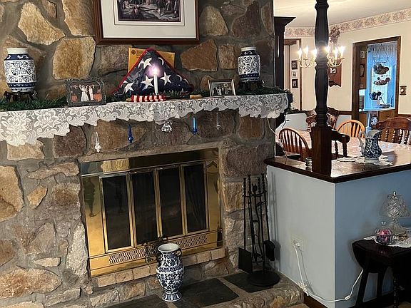 Expanded 3 bedroom Latimer Farms rancher with oversized garage and greenhouse. This home shows pride of ownership with numerous custom features. Enter into the large living room with wood burning stone fireplace with custom built ins and bow window. The formal dining room can host all your family's holiday dinners and opens to the massive family room with wood beam vaulted ceiling, wood burning stove and sliders to rear covered porch with ceiling fan and skylights. The eat in kitchen also has sliders that lead to rear deck overlooking the fenced rear yard and pond stacked with Koi fish. The main bedroom has custom vaulted ceiling, walk in closet and access to remodeled ceramic tile hall bath with custom vanity with granite top. There are also 2 other nice sized bedrooms with ceiling fans. The oversized 1 and 1/2 car garage has a newer door with opener and is heated to be used as a shop. The grounds have extensive landscaping and outbuildings that have become overgrown. This home is a gardener's dream with its numerous flower beds and greenhouse. Home also has a one year home warranty.