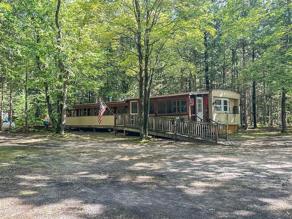 Inside, you'll find a large updated kitchen and open living area, designed for gatherings and relaxation. 2 bedrooms with plenty of sleeping space, full bath and laundry closet. New furnace, electrical and plumbing in 2024. Expansive front deck runs the length of the home and offers plenty of outdoor living space. A circle driveway ensures easy access and plenty of parking.