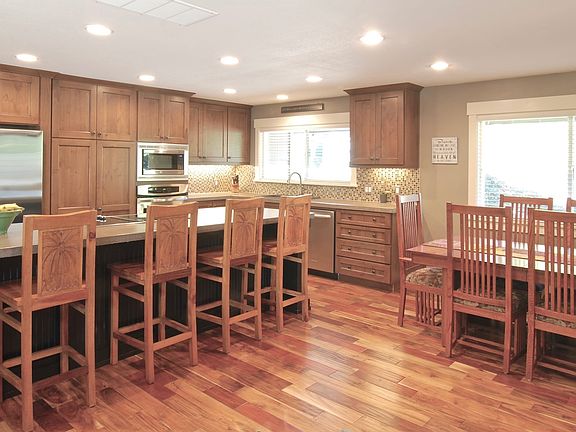 Beautifully updated throughout! Gorgeous Acacia hardwood floors, slate entry, custom counters (3.5'x10'kitchen isle), SS appliances, oil rubbed bronze hardware! Media Rm with theater seating and built-in B&W speakers. Vinyl windows, updated plumbing, new Hi-Eff furnace, 80gal water heater. 4+ car garage with extra space. Large, level and super private backyard. Quiet, safe neighborhood with nearby park and easy access.