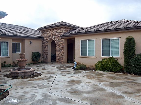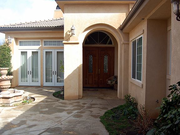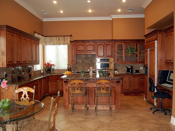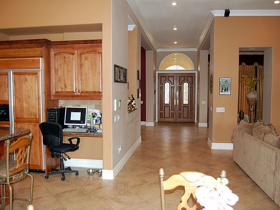 Quality, custom built home. Private, cul-de-sac location with unobstructed mountain and orchard views. Dramatic 12 ft. ceilings throughout living areas, which include great/family room, living and dining rooms. 3 fire places,1 double sided in living and family rooms and 1 in Master Suite. Beautiful Alder wood cabinetry through-out home. Kitchen is well equipped with all stainless steel, 5 burner stove, microwave and convection ovens, warming drawer, granite counter tops, large granite island with seating, butler’s pantry with sink and wind chiller refrigerator. Large Master suite and Bathroom with travertine, radiant heated floor, dual vanity, dressing table, walk-in closet, separate toilet/bidet, walk in shower and Jacuzzi tub. Laundry room with ample storage, sink and nice sized secondary bedrooms. Convenient, private casita with 1 bed and 1 bath, perfect for overnight guests, teen agers, in-laws, etc. 3 strategically placed air conditioners and tank less water heater for added comfort. Outside features include, professional landscaping, fully fenced, circular driveway gated for security, large front courtyard with fountain and fire pit, covered rear patio, pond, shed, 3 car garage and 2 stall RV garage 40 ft. deep with 12 and 12 ½ ft. doors