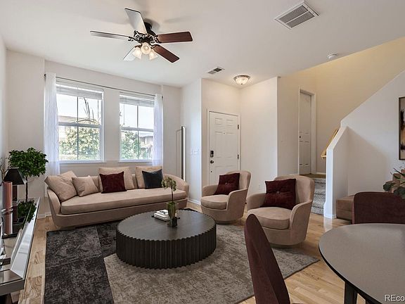Welcome to the Parkside Reunion neighborhood with this meticulous 3 bed, 3 bath home that exudes charm and functionality, offering an inviting atmosphere from the moment you step onto its gated front porch. Inside, the main level boasts an open concept design with hardwood floors and an abundance of natural light that streams in effortlessly. The kitchen, equipped with stainless steel appliances and a peninsula bar, is a focal point for both cooking and casual dining. Entertain or relax & unwind in the well-appointed living and dining room spaces. Completing the main level, you’ll find a convenient half bath and a laundry area. On the upper level, three bedrooms + loft await, including a spacious primary owners suite with a large walk-in closet for ample storage. The refined primary bathroom features a dual sink vanity, walk-in shower, private toilet room, closet, and tasteful tile flooring. Across the hall, discover a full bathroom and two perfectly-sized bedrooms. The bonus loft space is ideal for an office or work-out area. Included, you’ll find an attached two-car garage for added convenience. In prime location, imagine your days strolling to the adorable coffee shop nearby and gazing out onto the Rockies while sitting in front of the gorgeous Reunion Lake. Or take advantage of the recreation center and trails that enhance the quality of your life, all included in the HOA. With easy access to DIA, major highways, and 25 mins to downtown Denver, this home offers not only a comfortable living space but also proximity to some of the most desirable amenities.