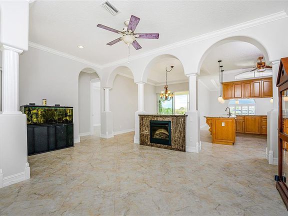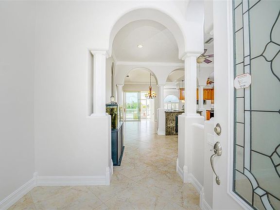Don't miss the opportunity to own this one-of-a-kind custom home builder's private residence with IMMEDIATE OCCUPANCY AVAILABLE. This beautiful 3 bedroom, 2 bathroom home was built in 2009 and resides on highly desirable SAILBOAT water. No bridges between you and open waters! The composite dock also features a massive 17,000 lb. boat lift, giving you little restrictions on the boat of your dreams. There is plenty of room to add a pool should you decide. The home features an open floor plan with plenty of sunlight, stainless steel appliances, high level granite countertops, a large pantry and wrap-around breakfast bar. The newly cleaned concrete tile roof adds strength and elegance to the home and will last for many years to come. The master bathroom has a massive walk-around shower and luxurious jetted bathtub. This is also a perfect home for dog lovers. The entire home features tile floorings, zero carpet. There is also a built-in dog door on the screened-in lanai which leads out to the fully fenced-in area behind the home. This fenced-in area is covered with salt-finish concrete and features landscape beds and a Koi Pond, allowing you to entertain and relax in tranquility while enjoying the water view. Also perfect for the car lover: The oversized 3 car garage is fully insulated and has its own air conditioner. There is a workshop area in the rear. 26' garage depth and 8' high doors allows pickup trucks to be parked inside. The garage floors have a brand new epoxy finish and feature high enough ceilings that a car lift could be installed. This home features moldings that you will not see elsewhere. Custom doors, carved door headers, ornate casing blocks, baseboard corner blocks, columns and beautiful corbels which were all fabricated specifically for this residence. The marble fireplace adds warmth and luxury to the front Living Room. Tray ceilings and ceilings with backlighting are found in several areas of the home, giving further custom touches and details. Other features include: Security system with monitoring, in-wall bug tube system and mature landscaping with custom retaining walls. This home is in close proximity to beaches, golf courses, and great dining options. Schedule your showing today!