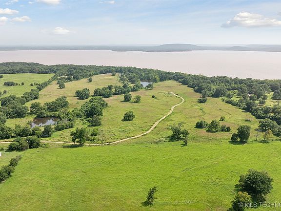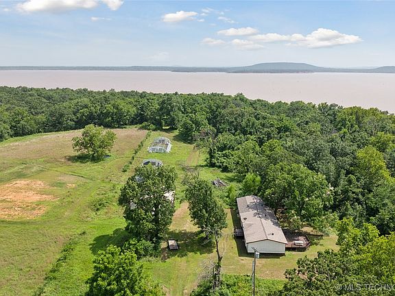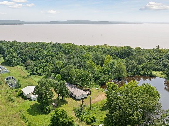 Secluded waterfront ranch located on 92+ fully fenced acres fronting Lake Eufaula's north shore with over 900 feet of shoreline, this is the only property to own land going into the shoreline and into the water. This workable ranch contains two ponds, one stocked and several outbuildings including a fabulous treehouse at the waters edge. As much fishing, hunting, camping, Jetskiing, boating, motorcycling, dirt biking and entertainment as your heart desires. Updated 3 bed 2 bath mobile home with attached oversized 2 car garage. Ranch's primary outbuilding is a 40 x 40 concrete floor shop with electric and 3 overhead doors. The secondary outbuilding is a multi-story multi-room treehouse with large deck. The large stocked pond sits just off the homes back deck. 15 minutes from Checotah and HWYI 40. 30 minutes from Eufala State Park. Enjoy the sunset on your back patio watching deer or fish Lake Eufaula or your pond. The property provides for the launching of power sports with an ATV or like. Perfect for fishing, hunting, horses, other Ag, ranch or business uses. This property could be the foundation for your retirement compound or estate on beautiful Lake Eufaula State Park. No restrictions. Property also has 2 green houses and additional 800amp is available. So much potential for so many things. Enjoy peaceful country living near town for all your needs. A COZY BRAND NEW TREE HOUSE WITH LARGE DECK BY THE WATER OF LAKE EUFAULA. A perfect place to relax and listen to the waves. You must come and experience the breathtaking natural surroundings that will bring you tranquility and solace. The tree house has full bath with shower, it is perfect for guest room or airBNB on hunting season.