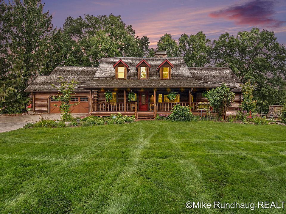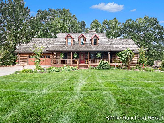 Step into this stunning log home exuding rustic charm. The home features a cedar shake roof and meticulously designed interior that captures the essence of cozy living. The home's open concept layout blends the unique details that sets it apart. The great room has expansive windows and features a two story fieldstone fireplace adding warmth and ambience. From sunrise to sunset, you'll experience the beauty of nature and wildlife on this amazing property. The 40 acres includes 20 acres of hay / pasture and 11 acres of fenced property with 3 separate paddocks, private frontage on Wilson Lake (8 acres stocked with fish). Enjoy outdoor living with an impressive outdoor kitchen complete with sink, pizza oven and wood grill, ideal for hosting gatherings and alfresco meals. The property offers a 40x50 barn with 5 stalls (with wooden floors and fans above) and a 40x80 pole barn with greenhouse and workshop. Enjoy walks through mature woods and well maintained stream on a path aprox 2/3 mile long. From sunrise to sunset, you'll experience the beauty of nature, wildlife and tranquility and the chance to create lifelong memories in your very own outdoor haven.