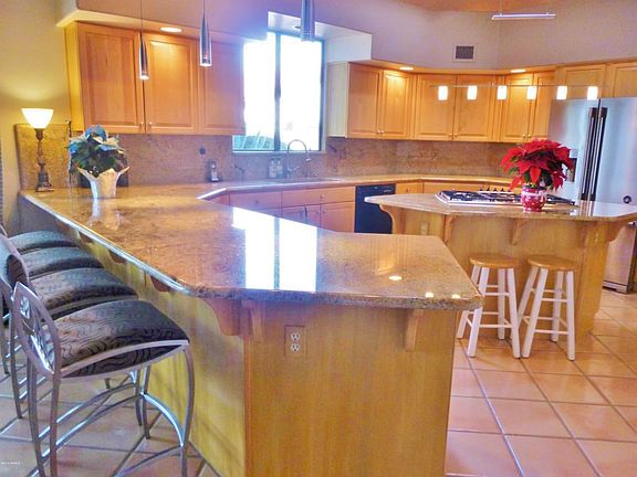 SOPHISTICATED ELEGANCE! Gated Sub with Views, views, views...Sits on a hilltop w/rooms to capture best views from all rooms! Breathtaking Vistas of Golf Course, Mountains and City Lights. Oro Valley Custom home has been fully Updated w/a high end Granite Chef's Gourmet Kitchen featuring Bosch, Thermador and Frigidaire appliances. A Wolf microwave, Wall Oven & Wine Chiller complete open Kitchen to Great Rm w/Pendant Lights over sweeping Granite Breakfast Bar w/see thru Fireplace to both Rms. Roller Sunshades on L/R windows. Master Bed has built-in electric heatalator w/granite Mantel & Surround. A screened in Pet Shelter is off Master. Master Bath has dual Moroccan Fossil sinks, Travetine, Granite, Flat Screen TV & a Soaker Jet Tub. Other two baths have Vessel Sinks with Granite Counters.