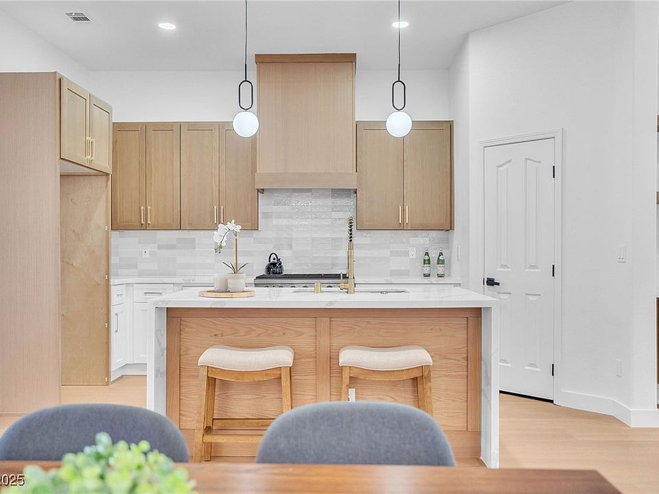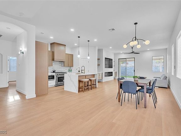 This Beautifully Fully Renovated One-Story Home sits at the end of the cul-de-sac in the heart of Summerlin. This home features an open floor plan, high ceilings, brand new LVP flooring throughout, Freshly painted, new baseboards, Custom Cabinets throughout entire property, Kitchen features beautiful waterfall island 36 inch stainless steel range, built in microwave, and dishwasher as well. Newly tiled backsplash. The inviting family room has a custom built fireplace/TV Media center with TV included! Both bathrooms have been completely redone with lovely oversized walk in shower in the primary. The primary bedroom has a custom built LED fireplace thats perfect for relaxing nights! All bedrooms featuring ceiling fans. The backyard features a covered patio and has recently been upgraded with new synthetic grass and landscape. This house is completely turn key and ready for move in! Low HOA!