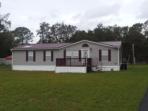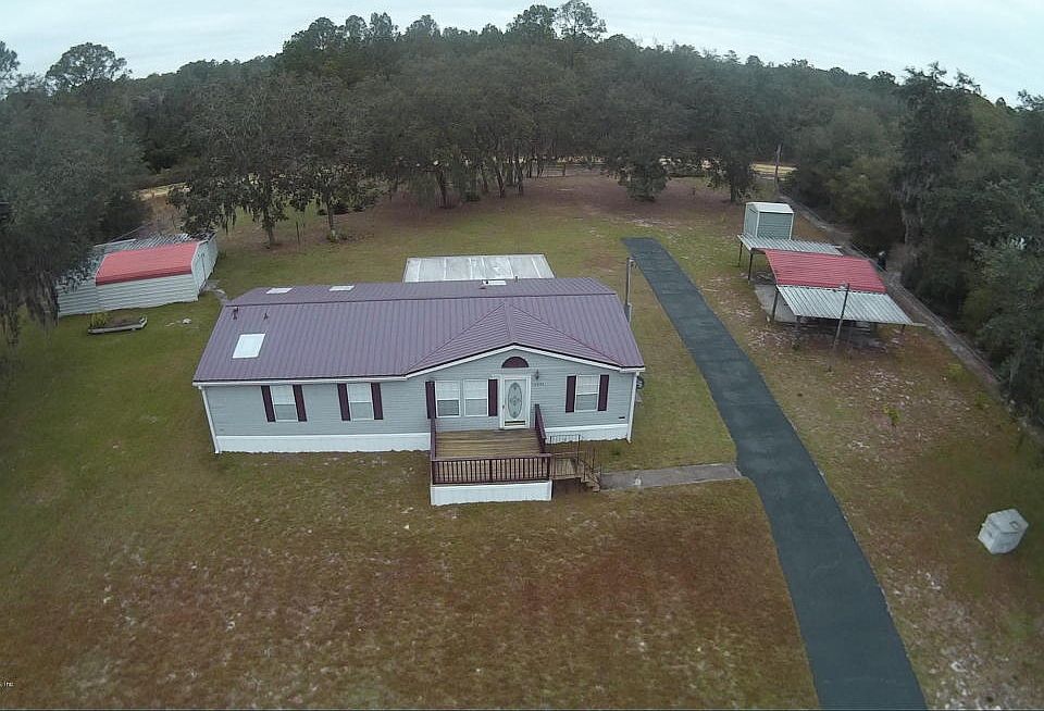 Nice 3/2 on completely fenced 1.26 acres on a paved road in the country. 3 bay detached carport plus garage/workshop and utility shed. Home features a newer metal roof with gutters and downspouts, spacious living room with gas log fireplace included, light and bright eat-in kitchen, dining area with glass sliders to large screened porch, split bedroom plan, master bath with corner garden tub and separate step-in shower, inside laundry, front deck, several citrus trees on property.