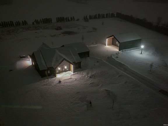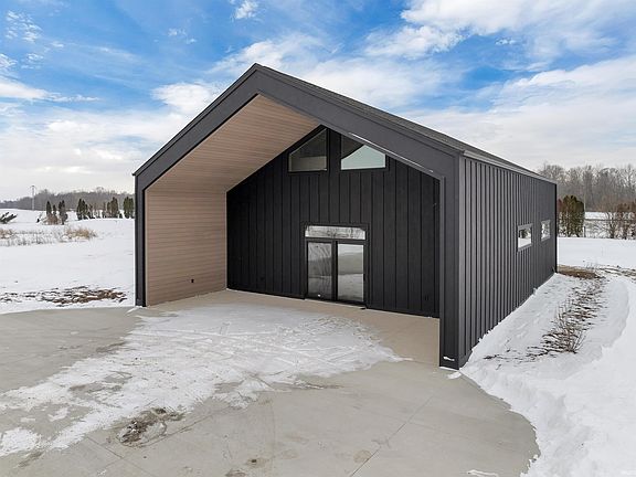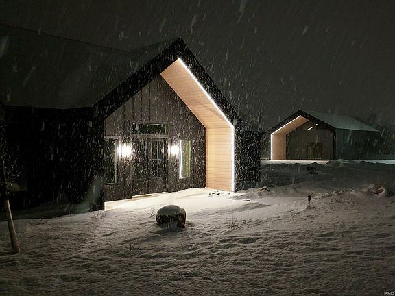Purpose-built with a modern Scandinavian minimalist design and custom crafted by Secrist Marketing Group, this newly completed residence blends clean architectural lines, high-performance construction, and warm natural textures into a private, design-forward retreat — a direct reflection of our motto: “We don’t meet the standard, we set it.” Set at the end of a long winding drive, the property includes a private pond with a beach area that was constructed as part of the overall project scope, complementing the home’s resort-style setting without sacrificing privacy or simplicity of design. The all-black exterior is accented by architectural indirect lighting at the main entry gable and the matching conditioned outbuilding, creating a striking presence both day and night. Inside, the home is anchored by vaulted ceilings with exposed beam trusses, triple-pane windows for superior efficiency and comfort, and continuous solid-surface flooring throughout. The kitchen was designed as both a workspace and showpiece, featuring a professional Wolf appliance package, custom full-height cabinetry, hidden walk-in pantry wall, integrated USB and device charging outlets at the countertops, and Cambria quartz surfaces carried consistently throughout. Custom millwork and built-ins extend across multiple rooms, including a dedicated office with concealed in-drawer power and printer storage, integrated power within the media center, and a designer locker system featuring magnetic piano-style finger hooks that recess cleanly when not in use. The primary suite offers a spa-level experience with a custom tile shower with rainfall head, freestanding soaking tub, floating dual vanity, modern lit mirror, and layered indirect lighting. The finished garage continues the same minimalist, high-function design approach with clean wall systems and utility features. Outdoor living is built for four-season use with a covered stamped concrete patio featuring recessed infrared heaters, a wood-burning fireplace with mantle, integrated media wall, and protected entertaining space. The matching detached outbuilding is fully heated and cooled and includes a half bath, offering flexible use for a studio, workshop, guest overflow, or executive hobby space. This SMG custom build delivers disciplined modern design, premium materials, and precision execution throughout — built to lead, not follow.