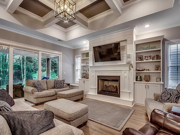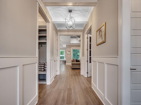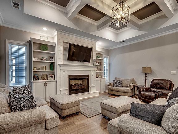 Gas fireplaceShiplap at the fireplaceCustom finishesFamily roomLinen and coat closetsLarge islandRoomy pantry