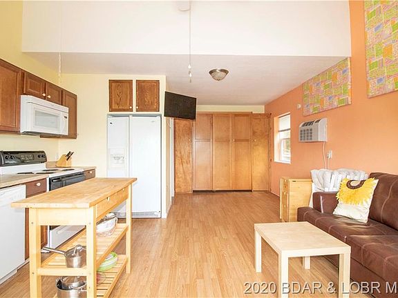 Spectacular views from this very unique property. A combination of home and shop offers about 500 square feet of living area. Small kitchen with appliances, laundry area, pull down Murphy bed, and large screened in porch with lake view. Building is all metal construction and is 1200 square feet. Also a 40 x 16 lean-to attached to building with concrete floor. Lots of shelving in shop and wired for 220. Property consists of 2 lots, each with over 100 feet of lakefront. Lots can be divided. There are 2 RV hookups. Large steel and concrete dock with boat hoist, PWC double slip and lift, swim platform, and small bar. Path to dock is concrete and wide enough for golf cart. Located just a few minutes from Camdenton and Sunrise Beach on quiet waters of Big Niangua Arm. Property sits at end of road for added privacy. Trim some trees and view becomes even more incredible. Great place to build your dream home and enjoy our beautiful Lake of the Ozarks. See it Today!!!