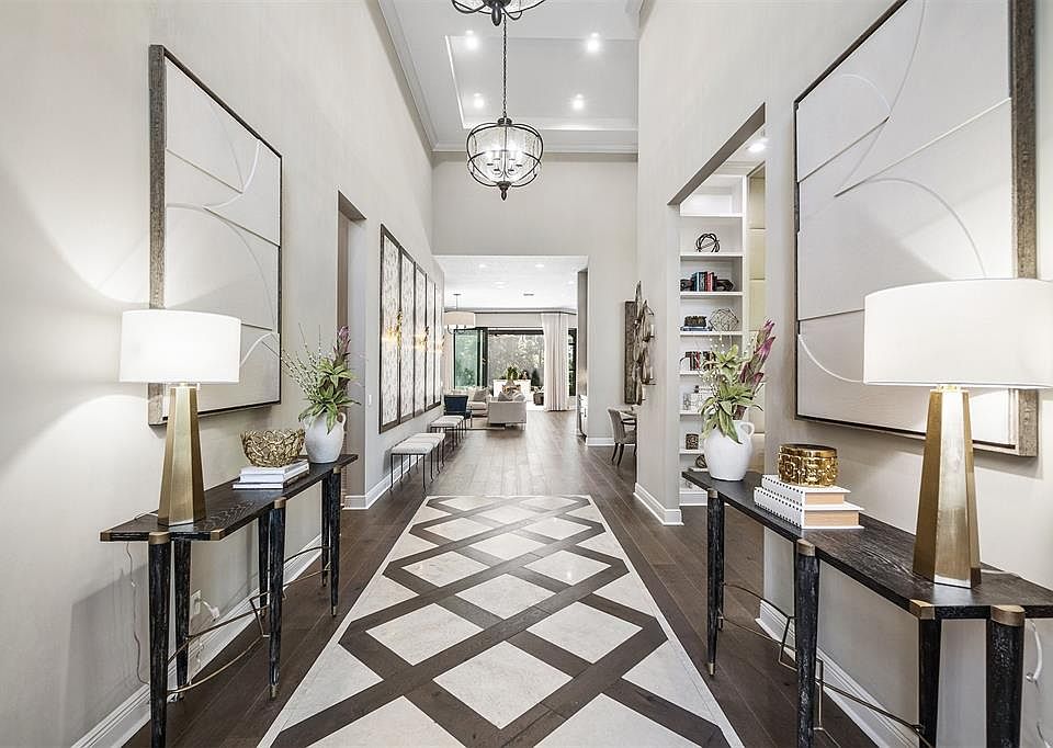 Gas-plumbed fireplaceDramatic waterfall islandSpa-worthy bathroomFull summer kitchenCustom drapesBrand new carpetFloor-to-ceiling built-in bookshelves