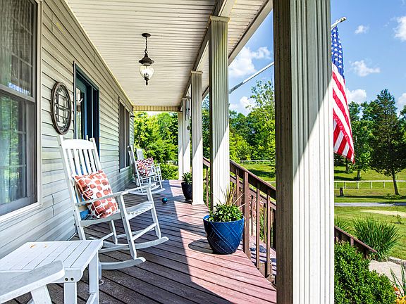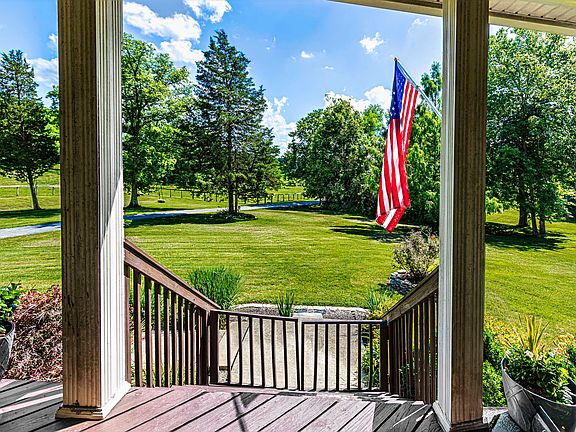 Best of both worlds! Out of sight and gorgeous, this home is a treasure! Multi-generational opportunity too! First floor primary, large gathering room, dining area, laundry room and 2 full baths on the first floor. Great set up indeed as the second floor has two more bedrooms and full bath plus gaming nook! The lower level is another home! Three bedrooms or office, full bath, family room, kitchenette, storage and storm shelter. Above ground pool, deck, 2-car detached garage/workshop to hold toys! Paddocks out front, paved driveway, wooded in the back. Two fuel sources, wood burning boiler and heat pump. This one is divine!! AHS Warranty! VA assumable loan to eligible qualified buyer.