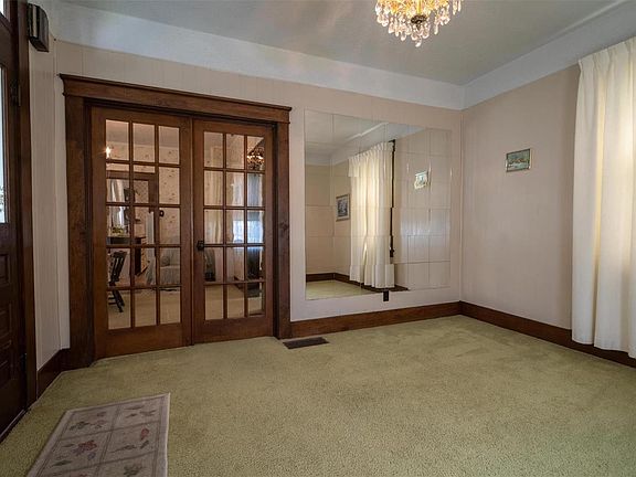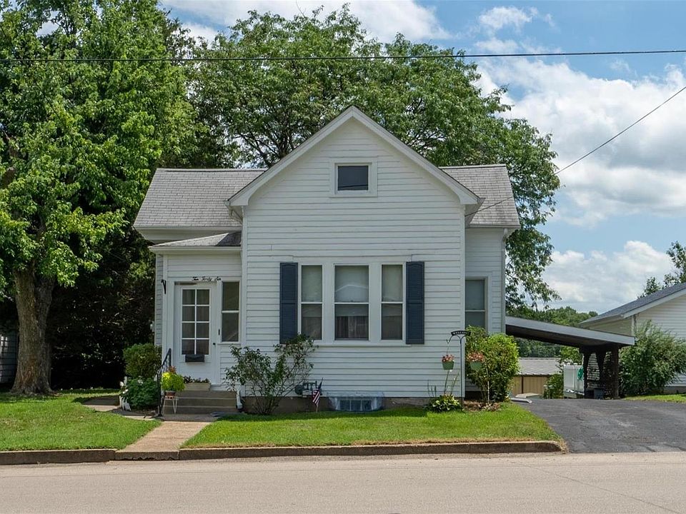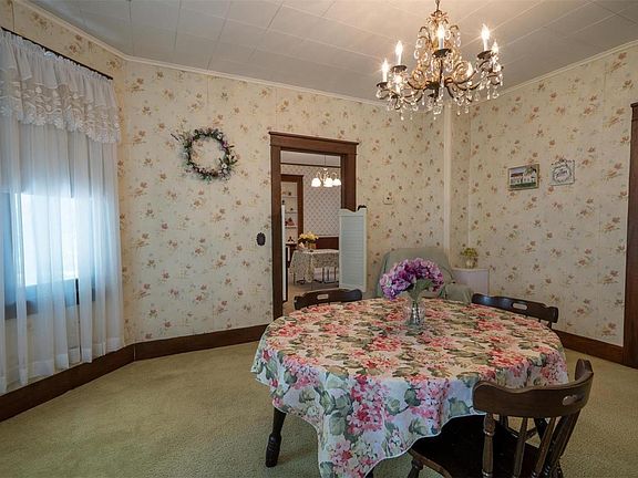 Don't miss out on this clean and affordable home. 2 bedroom, 2 baths, large eat in kitchen. 5x5 pantry area, separate dining are with french doors that open up into living room. Enclosed front porch. Full basement. Nice concrete patio, 10x30 outbuilding, Carport, Large level yard, close to downtown. Call for your private showing.
