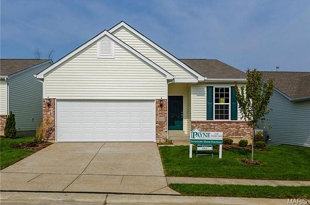 Brand new, FREE STANDING, carefree living home by Payne Family Homes! This 2 bedroom (plus a Flex Room), 2 bath, 1,605 square feet ranch has brick, low maintenance siding, 2 car garage with opener, full sod, professional landscape, exposed aggregate drive-sidewalk, an irrigation system and backs to trees. Features include 9 foot ceilings, gas fireplace, Granite countertops, 42 inch Maple cabinets, stainless steel appliances, gas stove, Kitchen island with breakfast bar, wood laminate in the Foyer-Extended Foyer-Café-Kitchen-Great Room, Luxury Master Bath, raised height vanity in Master Bath, brushed nickel lighting and door hardware, wrought iron balusters at open stairs to lower level, custom wall color throughout, rough in bath, 9 foot tall foundation pour, walk out basement and more. A low monthly fee covers lawn, landscape, irrigation, exterior maintenance (per CCR’s) and some insurance. The community is nestled in a quiet setting yet is near the restaurants and shopping on Wentzville Parkway. Owners have access to a community pool (annual fee) and are near the Golf Club of Wentzville's 18 hole Golf Course.