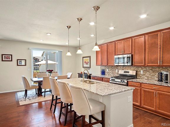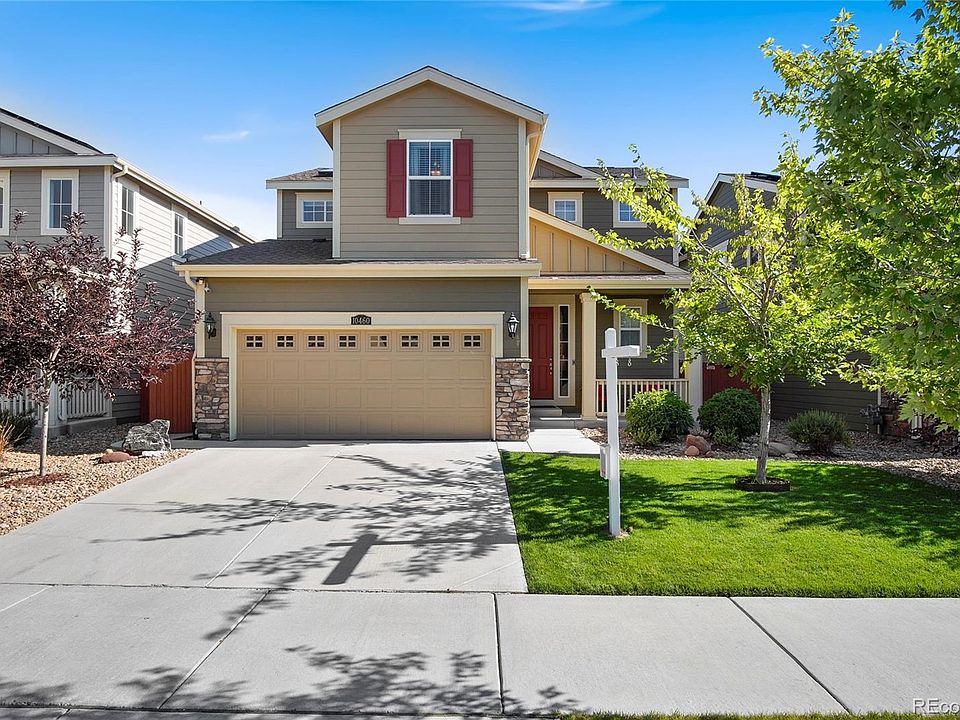 Spacious and immaculate 2-story home filled with upgrades in the quiet community of Sierra Ridge. Well-appointed kitchen is the heart of the home and boasts granite countertops and backsplash, a pantry, breakfast nook, counter seating, stainless steel appliances including a gas range. Easily host guests from the open-concept kitchen that flows seamlessly into the spacious family room and out onto the sunny patio. Dine under the stars or soak up some sunshine on the patio that looks out onto the fenced backyard. Walk upstairs to the sizable master suite that delights with an elegant tray ceiling, walk-in closet & an en-suite 5 piece bathroom with granite countertops and large soaking tub. Upper level is completed by 3 secondary bedrooms that share a full bath with double sinks and a convenient upstairs laundry room. Unfinished full basement offers excellent additional storage space or the possibility to finish and expand the livable square footage. Relax in the private backyard that features a large patio, lush lawn and lighting for evening entertaining. This fantastic home offers you the comfort and security you have been looking for with Ring doorbell, Ring alarm, (2) Ring Smart cameras. Night Owl Close Circuit cameras, surround sound wiring, upgraded light switches with dimmer, Ecobee Thermostat with Alexa, USB outlets in the kitchen, whole-house humidifier, whole house water filter and softener and more! Wonderful community amenities including a resort-style pool, clubhouse, basketball courts, playground, parks, open spaces and trails. Located just three miles to I-25 you are just minutes away from great shopping and dining found at Park Meadows Mall. With the Lincoln and Jordan Park and Ride station just 3 minutes away, it's an easy commute to downtown and more. Don't wait to set your appointment to see this fabulous home!