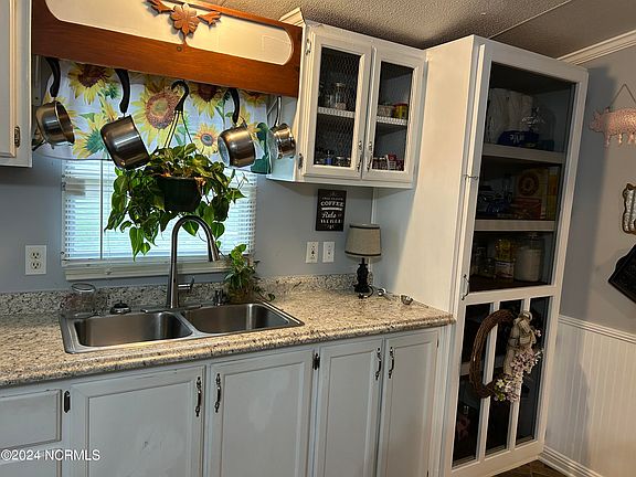 Interior has had some remodeling changing a 3 Bedroom into a 2 Bedroom 2 Bath. This helped make a larger living room and Kitchen. Seller has made a really cute pantry in the kitchen and built in corner cabinets in the dining area. Some updated flooring. Kitchen appliances, stove, refrigerator will both stay, laundry area with washer/dryer hook ups off the kitchen. Outside staying will be 2 double car carports. Some fencing across the front but none in the back. The Cedar Wood Storage Building w/electric & sheet rock walls will stay. Heat pump is 5 years old and the roof has been taken care of and has no leaks.