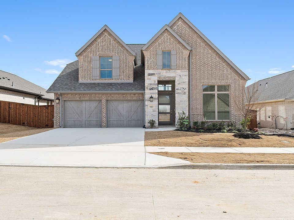 Home office with French doors and 11-foot ceiling set at two-story entry. Open kitchen features walk-in pantry and generous island with built-in seating space. Dining area opens to two-story family room with a wood mantel fireplace and wall of windows. Primary suite includes bedroom with 10-foot tray ceiling. Double doors lead to primary bath with dual vanity, garden tub, separate glass-enclosed shower and large walk-in closet. An additional bedroom is downstairs. Secondary bedrooms and game room with 10-foot tray ceiling are upstairs. Covered backyard patio. Mud room off two-car garage.