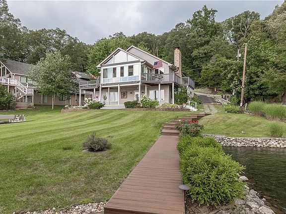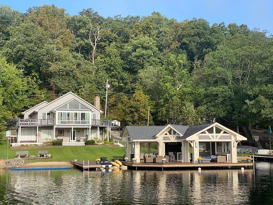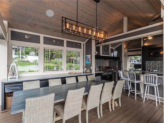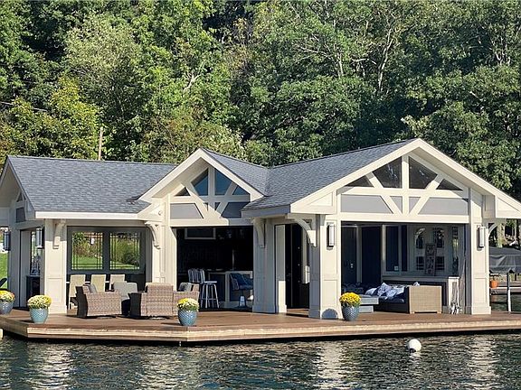 AN ENTERTAINERS DREAM LAKE HOUSE! WALKING IN YOU'RE IMMEDIATELY GREETED W/VAULTED CEILINGS & PANORAMIC LAKE VIEWS. UPSTAIRS IS 1 EN-SUITE BED, FAMILY ROOM W/GAS FP, OPEN KITCHEN/DINING WITH TONS OF STORAGE, QUARTZ COUNTERS, WINE FRIDGE & PROFESSIONAL AUDIO SYSTEM W/SPEAKERS INSIDE & OUT AND A 4 SEASON SUN PORCH. THE LL HAS A GUEST ROOM W/GAS FP, LARGE PRIMARY SUITE WITH SUNRISE VIEWS, WIC WITH CALIFORNIA CLOSET SYSTEM AND 100 BTL WINE STORAGE. THE FLAT APPROACH TO THE LAKE IS BEAUTIFULLY LANDSCAPED W/IRRIGATION. THE OVER WATER BOAT HOUSE IS ONE OF A KIND! SPANNING CLOSE TO 2000 SQ FT OF CUSTOM FINISHES: KITCHEN, BATHROOM, 7 POWER ROLL UP DOORS, D/W, BUILT IN GAS GRILL W/HOOD, CABLE, TV, WI-FI, ICE MACHINE, ALL W/TREX DECKING.