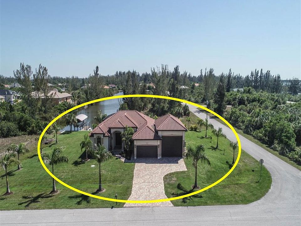 Are you looking for a home with Sailboat water that has an R/V garage? This property is situated on a double lot with newly constructed sea wall, boat dock and, 8,000 lbs boat lift, it also has a 2-car garage with an attached R/V or boat garage (16ft wide by 30ft deep and a 14 ft tall door). Curb appeal abounds with the brick paver driveway leading to this Mediterranean themed home design. Upon entering you know that this is where you can entertain in style. This home offers luxury and comfort, with first class finishes. The view from the living room through the sliders to the heated saltwater pool and expanse of water beyond is mesmerizing. You have premium laminate and tile throughout, large great room, master suite oasis with soaking tub and roman shower, and generously sized guest bedrooms. The soaring ceilings allow light to permeate the home. Cooking will be amazing in the gourmet kitchen with gas (propane) cooktop, 42” crowned cabinets and more.The star of the kitchen is the Frigidaire stainless appliances featuring the built-in all fridge and all freezer combo, and a large island. The large lanai has a saltwater pool overlooking a long canal view. This house also features impact resistant windows throughout, oversized (extra deep) garage, concrete flower bed curbing, landscaping lights, 40 palm trees of different variety, irrigation w/canal pump, 6in gutters and more. Whether you are hopping on your boat, playing one of many area golf courses or enjoying the nearby beaches this home offers the Florida lifestyle as it was meant to be.