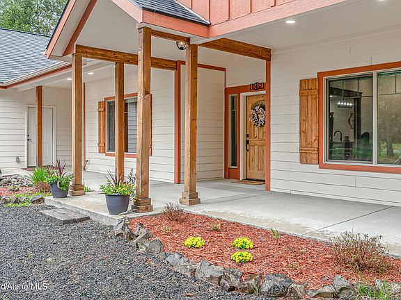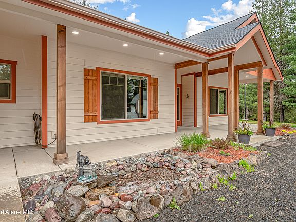 Just 20 minutes south of town and a short drive to Lake Cd'A's Rockford Bay or the Cd'A Casino & Resort, in a gated community of just 5 parcels, is this charming custom home on 5 private, beautiful acres. Imagine mornings on your covered front porch enjoying the sights and sounds of local wildlife! The heart of the home is the vaulted great room with its beautiful tongue & groove ceilings and warm earth tones. The great room flows into the dining alcove with its wall of windows and French doors leading to the covered back patio. The chef's kitchen boasts many custom details including hands-free lighting and exhaust fan operations, large island with breakfast bar, complimentary cabinet finishes, floating shelves, specialty cabinets and gorgeous granite & tile details. Stainless steel refrigerator, DW, cooktop, wall oven & microwave are all included. The spacious primary bedroom suite includes a walk-in closet and large bathroom with knotty alder cabinets, dual sinks, granite counters & tiled shower. There's another bedroom and full bath with tiled shower, plus a generous office/3rd bedroom with glass pocket doors. The home has an insulated crawl space, on-demand hot water & is pre-wired for a generator. Outside is a Quonset hut, RV parking with hookups and sewer dump, raised garden beds, private well with on-site fire suppression capacity. Come enjoy all the privacy and solitude you could ever want!