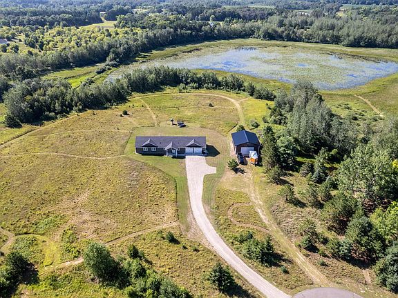 Country tranquility is situated on 9.49 acres. Surrounded by wildlife; deer, turkey, ducks, and pheasants- perfect for hunting. Three bedroom, two bathroom slab on grade on the end of a cul-de-sac. Home features a master bedroom, open layout with vaulted ceilings. Raised knotty hickory cabinets. In-floor heat. The dining room leads to the walk-out patio overlooking the pond, making it perfect for entertaining guests. Oversized heated two-stall garage. Pole barn 30 x 35. Several mowed trails throughout the property. Crushed concrete driveway. Playground stays with home.