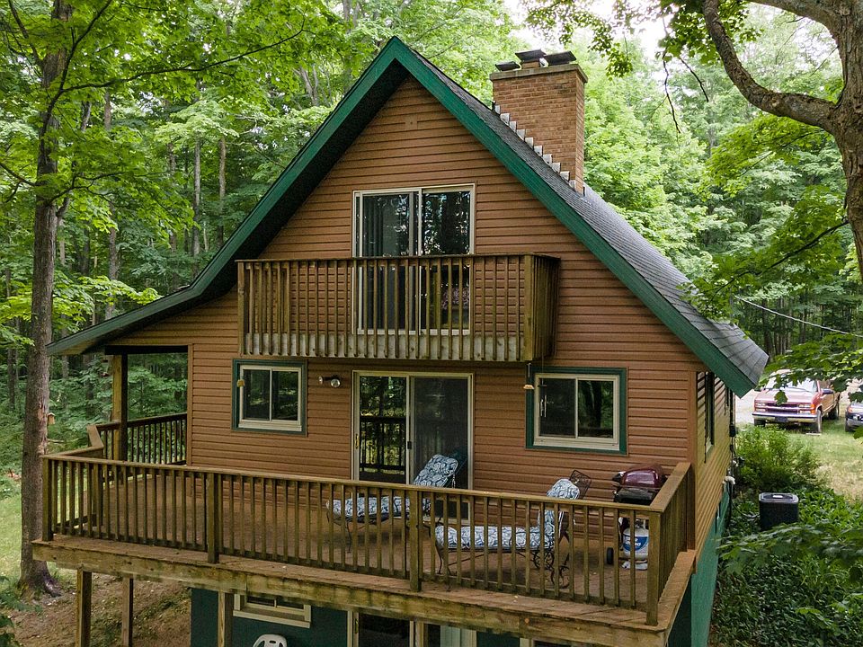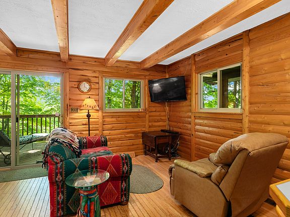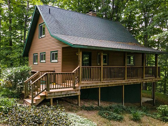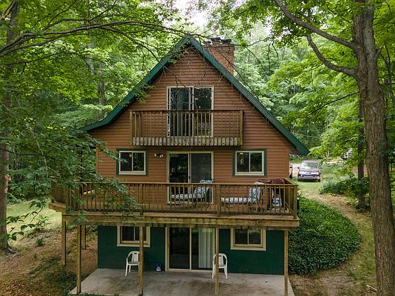 Relax and unwind in this enchanted 3 bed, 2 bath chalet. Perched on 2.5 acres with beautiful views, this is the embodiment of Northern Michigan. Adorned with half-log and knotty-pine interior, wrap-around deck and a walk-out basement, newer roof and siding. A fourth non-conforming bedroom could have an egress window added to make this a true four bedroom home. DSL Service is available. Enjoy the ambiance of either fireplace and let your cares fall away. Shared access to Lake Elizabeth and it's amenities round out this four season home.